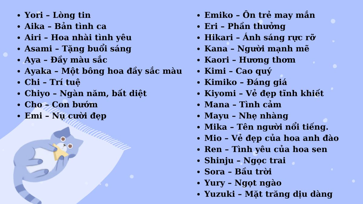 Những tên này phù hợp với mèo con, mèo nhỏ nhắn, dễ gọi và thân thiện.