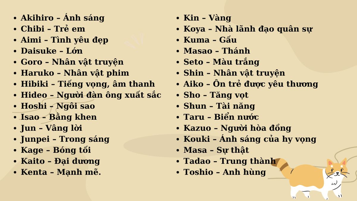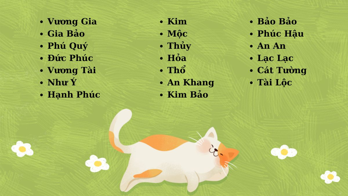Như vậy, 100 cái tên này đã bao gồm nhiều phong cách: dễ thương, cá tính, gắn với màu lông, đồ ăn thức uống, nhân vật phim ảnh và cả yếu tố phong thủy. Anh có thể lựa chọn tùy theo sở thích và đặc điểm riêng của mèo cưng để tạo sự gắn bó lâu dài.